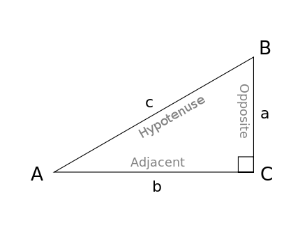 Depending on the value of the angle BAC, the ratios between the three sides of the triangle will vary. These three sides are generally given the names 'hypotenuse' (H), 'opposite' (O) and 'adjacent' (A). The opposite side is opposite the angle being considered. The hypotenuse is the side opposite the right angle, and the adjacent side is the remaining side, which is also next to the angle being considered.