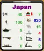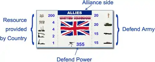 • Resource provided to player by Country. In example is $M 200, 4 Infantry, 4 Tanks, 2 Aircraft and 1 Battleship each turn.