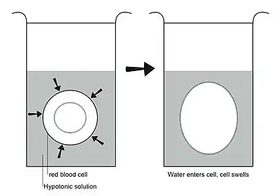 The plasma membrane of cells acts as a semi-permeable membrane. If red blood cells, for example, are placed in water, the water crosses the membrane to make the amount of water on both sides of it equal (see diagram 3.7). This means that the water moves into the cell causing it to swell. This can occur to such an extent that the cell actually bursts to release its contents. This bursting of red blood cells is called haemolysis. In a situation such as this when the solution on one side of a semi-permeable membrane has a lower concentration than that on the other side, the first solution is said to be hypotonic to the second.