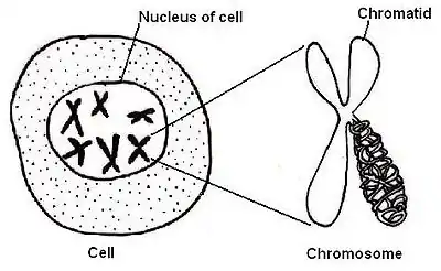In cells that are not dividing the chromosomes are very long and thin and appear as dark grainy material. They become visible just before a cell divides when they shorten and thicken and can then be counted (see diagram 3.14).