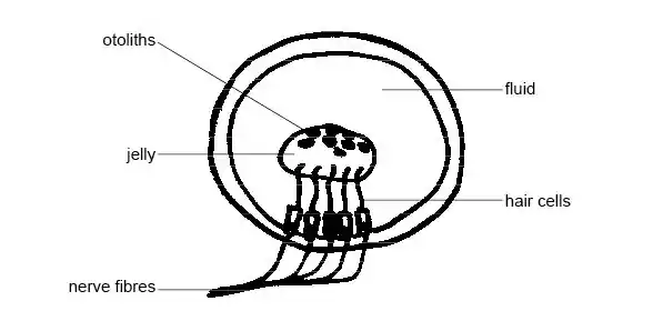 The otolith organs are sometimes known as gravity receptors. They tell you if your head is tilted or if you are standing on your head. They consist of bulges at the base of the semi circular canals that contain hair cells that are covered by a mass of jelly containing tiny pieces of chalk called otoliths (see diagram 15.10). When the head is tilted, or moved suddenly, the otoliths pull on the hair cells, which produce a nerve impulse. This travels down the vestibular nerve to the cerebellum. By coordinating the nerve impulses from the semicircular canals and otolith organs the cerebellum helps the animal keep its balance.
