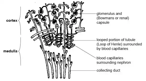 Note that the glomerulus, capsule and both coiled parts of the tubule are all situated in the cortex of the kidney while the loops of Henle and collecting ducts make up the medulla (see diagram 12.5).