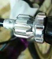 ![]() A typical plastic barrel-adjuster. The housing normally would abut within the adjuster-cap while the cable continues onward. | ![]() This type of cable cap is crimped onto cable ends, like the ones on the brake and derailleur. |