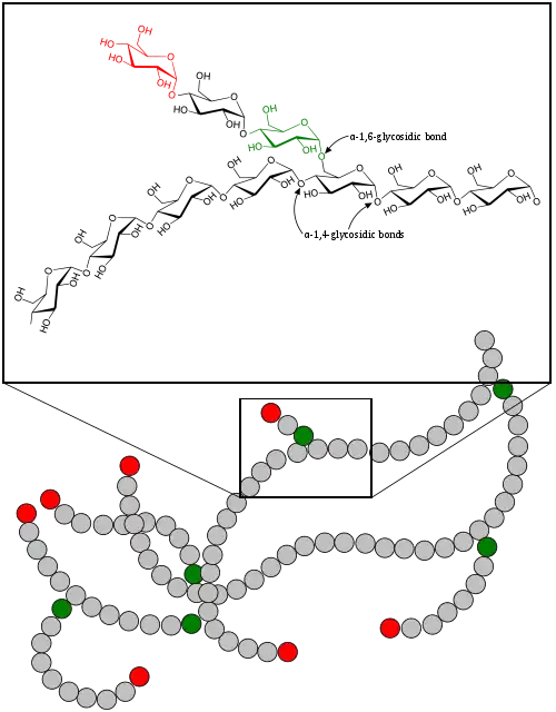 In glycogen, teo types of bond connects monomers. One of them is alpha-1,4 bond links linear ordered glucose residues. The other one has the name alpha-1,6 linkage provides connection between two parallel glucose chain. Via alpha-1,6 bond new branches can be made. Thus it is branching linkage.