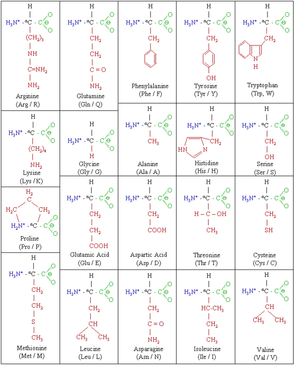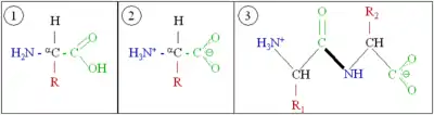 Two amino acids with different side chains react when the amino-terminus (red) of one joins the carboxy-terminus (blue) of another are linked by an amide bond (green). See also the mechanism of peptide bond formation.)