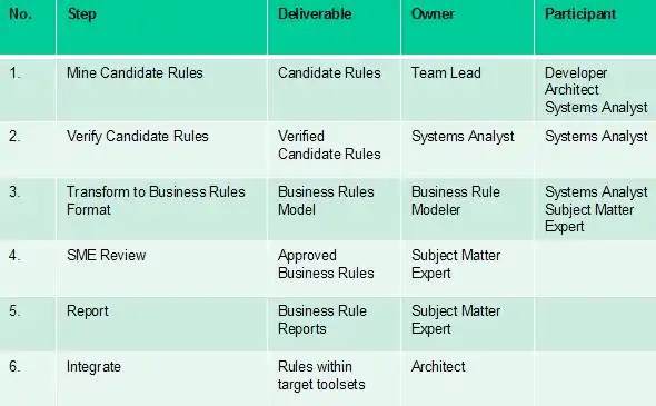 Each step should be defined in detail, following an adopted methodology, project scope and constraints and rule mining technology usage. There may be multiple iterations of the first few steps until the rules are in an approved, final format.
