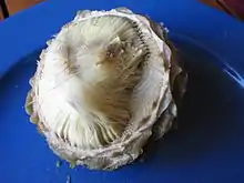 After cooking, the large leathery "leaves" forming a tight rosette are pulled off one by one, and their soft, inner basal part (usually) is dipped in some kind of sauce, perhaps mayonnaise or vinaigrette. The dipped soft part is then scraped off with the teeth and all the rest of the leaf discarded — absolutely not to be eaten. The fleshy, edible part is delicious, but quite sparse in proportion to that which is discarded.