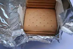 Hard tack is a cracker/biscuit flat-bread used during long sea voyages and military campaigns before the introduction of canning as a primary food-source. Mostly inedible for dry and hard preservation, it was usually dunked in water, brine, coffee, or other liquids, or cooked into a skillet meal. This cracker was little more than flour and water which had been baked hard and would keep for months as long as it was kept dry. Also known as a sea biscuit, sea bread, or ship's biscuits.