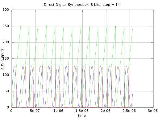 The preceeding figures have been made with a nice step value: 16. When the step value doesn't exactly divide the counter range, the teeth of the sawtooth are more ragged and the square wave output shows a kind of jitter: its mean frequency is the desired one but the signal edges are shifted to the closest active clock edge.