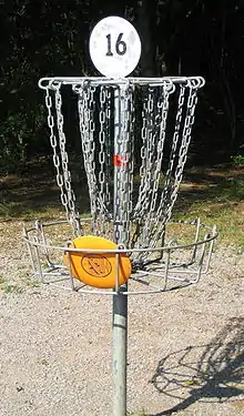 Disc golf is similar to traditional golf and uses much of the same rules and terminology. As in ball golf, a course usually consists of 18 holes. Unlike ball golf, most courses are located in public parks and are free to play, although some courses require a nominal fee, and the sport requires inexpensive discs instead of costly clubs and balls.[2] The modern disc golf target consists of a metal basket with chains hanging over it and was invented in 1976.[3]