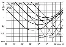 - ↑ Murata: Basics of capacitors, lesson 2 Includes graph showing impedance as a function of frequency for different capacitor types; electrolytics are the only ones with a large component due to ESR