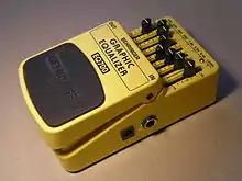An equalizer adjusts the frequency response in a number of different frequency bands. A graphic equalizer (or "graphic EQ") provides slider controls for a number of frequency region. Each of these bands has a fixed width (Q) and a fixed center-frequency, and as such, the slider changes only the level of the frequency band. The tone controls on guitars, guitar amps, and most pedals are similarly fixed-Q and fixed-frequency, but unlike a graphic EQ, rotary controls are used rather than sliders.