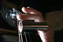 A slide is a metal/glass/ceramic tube which fits over a finger (most commonly the ring finger or little finger, but any will work). If you wish to experiment with slide guitar, but do not have a slide, objects ranging from lighters and glass bottles to sections of metal pipe and batteries can work just as well, and in some cases provide entertainment and stage presence to a performance. Do not press the string down. The slide rests on the string, not enough to give fret buzz, but enough to stop the string buzzing against the slide. Some players will lightly deaden the string behind the slide with a trailing finger to stop any unwanted vibrations.