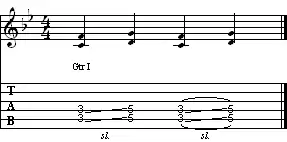 Less commonly, tablature can instruct the guitarist to "slide into" or "slide out of" a note. In printed tablature, they are notated identically except, in the case of slide-into, the first note is omitted, and in the case of slide-out-of, the second note is omitted. In other words, the note slides in from nowhere, or out to nowhere. It simply tells the guitarist to quickly slide from or to an arbitrary point, usually only a few frets away.