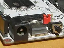 The Mizar32 base board can be powered in two different ways: from its USB socket or from its DC power jack. There is a three-pin header on the main board, "JP1", just behind the user button "SW2", which selects the power source that the Mizar32 will run from.