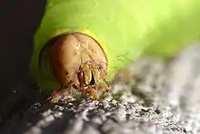 Caterpillars do not have very good eyesight. Rather than having fully-developed eyes they have a series of six tiny eyelets or 'stemmata' on each side of the lower portion of their head. They can probably form well focused, but poorly resolved images (Scoble, 1995). They move their heads from side to side probably as a means of aiding the resolution of objects, particularly plants. They rely on their short antennae to help them locate food. The larvae of sawflies differ from true caterpillars in this respect, as well, as they have prominent ocelli on the head capsule.