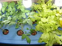 Wipe down inside of tote, cleaning up fragments. Add water and fertilizer solution (see above) to the tote. Use de-chlorinated water or let system run for a few minutes beforehand to de-chlorinate. Chlorine dissipates on contact with air, and chloramine takes longer to dissipate. Set in lid and net-pots. 1 net pot can be left out to let light in for the fish, but not too much light should be let in, for plant root health. Fill the net-pots halfway with substrate material. Add bulbs, stem cuttings or seeds. (Don't use plants dangerous to fish). Let plant stems grow before adding the rest of the material. Rockwool is not aerated enough, so it is ideal for balling around small seeds or layering around a stem cutting. Most material needs to be a porous. Coco-peat helps prevent fungus formation. Add goldfish, and feed them daily. Goldfish seem to graze on algae. Algae eaters, shrimp and snails are optional for cleaning up algae. The fish in this type of aquaponic system are hardier than plants. Once the fish are established they do the work of keeping the fertilizer level stable.