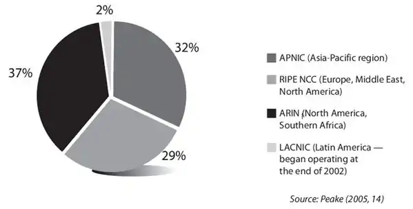 As noted in Section II, the shortage of IP numbers has been a matter requiring governance solutions. Developing countries, in particular, have been concerned as over 80 percent of existing IP numbers have been allocated to organizations in North America. This anomalous situation largely exists due to the historical development of the Internet, and the fact that early IP allocations were made on a first-comefirst-served basis. Since the mid-1990s, however, IP numbers have been managed by RIRs, and have been allocated on the basis of demonstrable need. Figure 2 includes the list of RIRs and the percentage of IP numbers allocated by them since 1999. It shows that the historical anomaly has somewhat righted itself, although concerns for inequalities persist in IP allocation.