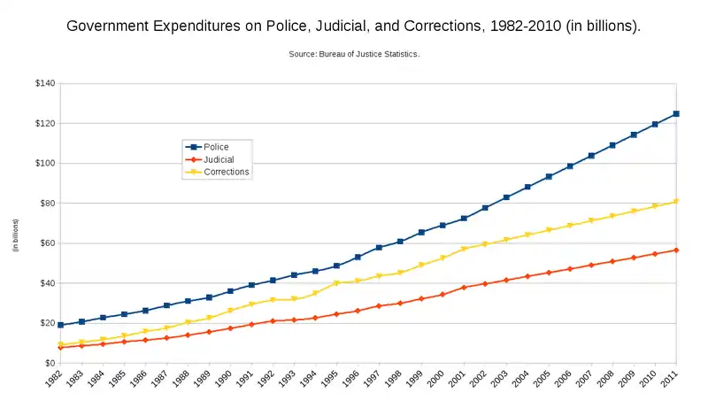 Another interesting characteristic of the U.S. is the amount of money that is spent on the correctional system. Policing the nations streets is the most expensive component of the correctional system, followed by housing prison inmates. The average annual cost for one federal prisoner exceeds $20,000.[12] The judicial process is the least expensive, but the combined expenses of all three elements total over $200 billion annually (when you combine state, local, and federal expenditures).[12]