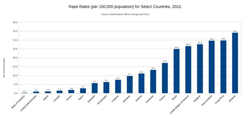 Another telling crime statistic that is traditionally seen as highlighting power imbalances is the number of rapes in society. While the focus of this chapter is not on exploring the motivations behind rape, the number of rapes in the U.S. and internationally can be seen to reflect power imbalances between men and women as men are far more likely to rape women than vice versa. The figures below show that rape rates in the U.S. have declined in recent years and also compare rape rates from select countries around the world.