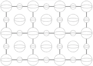 Remarkably, the explanation for the cubical external shape is the simplest one possible: the internal shape, the way the atoms lie, is also cubical. The internal structure is pictured below. Salt is sodium chloride, and the small spheres shown are sodium while the big ones are chloride. (To simplify the view, only the sodiums and chlorides on the front, top, and right are shown.)