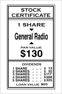 For making your own stocks (five copies of each), the table below provides the Par Value (purchase price), the dividend payments for levels of ownership, and the Loan Value (mortgage value).