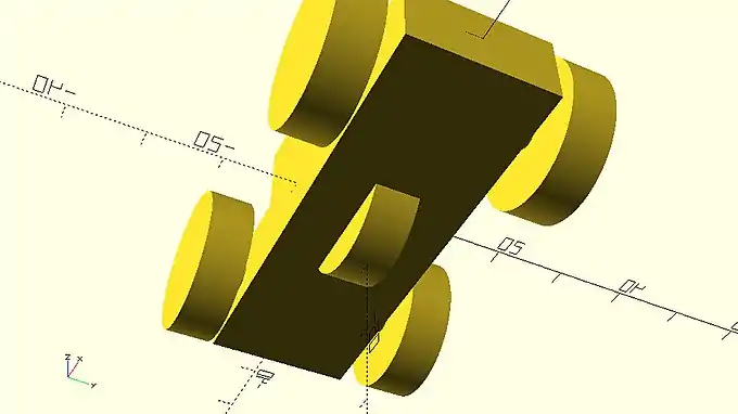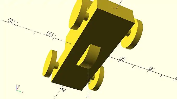 You should notice that something unexpected happened. A wheel has been created at the origin. This is the object of the simple_wheel script. When you use include, OpenSCAD treats the whole external script that you are including as if it was a part of your current script. In the simple_wheel.scad script, aside from the simple_wheel module definition, there is also a call to the simple_wheel module which creates a wheel object. As a result of using the include command this object is also created in the car’s model. This is something that you are going to change by using the use instead of the include command, but don’t bother about it for a moment.
