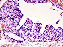 ![]() Hyperplasia of the thyorid follicles in hyperthyroidism, H&E staining. |