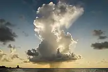 These clouds are the classic white puffy, cotton-candy like clouds you observe on a late summer afternoon. The tops of the cloud are often rounded, as the cloud grows upward, with a flat base that maybe a few hundred meters above the ground. In the late afternoon, cumulus clouds can grow larger forming a cumulus congestus, or towering cumulus. If enough moisture develops in a cumulus cloud, and it grows even bigger, and grayer, it can turn into a cumulonimbus cloud.