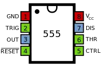 The 555 timer IC is a very versatile and useful component and can be used for many things, from giving clock pulses to switch debouncing and as an output transducer. The basic 555 IC is housed in an 8-pin carrier, and these come in DIL and SOIC formats. They run from 3-15V, and are generally quite hardy devices. The name "555" originated from a design feature, as there are three 5 kilo ohm resistors present in the input voltage divider network of the device.