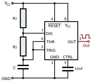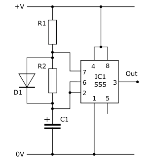 This variation allows much easier control of the mark-space ratio without too much impact on the frequency. The only difference is a diode between Pins 6 and 7, with the cathode at Pin 6. The effect of this is to shunt resistor R2 when charging C1. This means that C1 charges though R1 only. This removes R2 from the "high-time" equation, and make calculating the mark-space ratio easier and prevents the frequency from being altered excessively by changes in the mark-space ratio ( although this still happens to a certain extent).