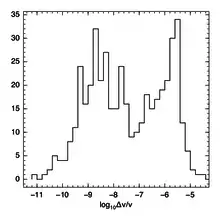 In the figure we show the distribution of (i.e., glitch sizes) for all the radio pulsars in the Jodrell Bank glitch database as of 11th Oct 2015. The script used to make this figure is provided here. In this figure, no attempt has been made to account for observational selection effects. Different pulsars have different data spans, timing precision and observation cadence. This means that the ability to detect a glitch of a certain size is not the same for all pulsar data sets.