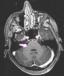 - Imaging: MRI with gadolinium can detect tumors as small as 1-2mm. Seen as an enhancing lesion “ice cream cone” in the region of internal acoustic canal or a “dumbbell” extending into the foramen magnum.