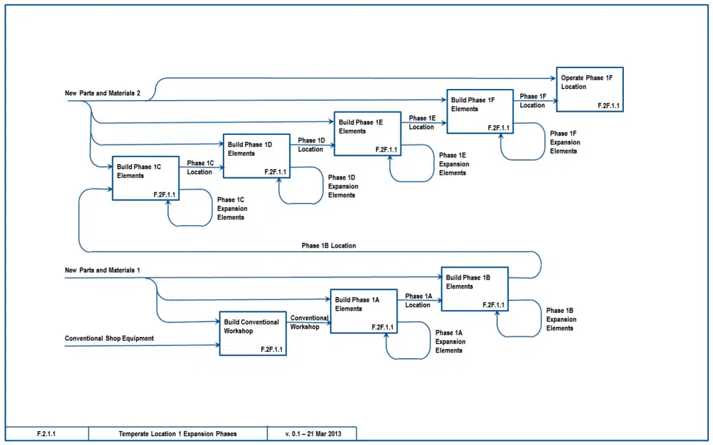 The general output goal is to provide some of the physical needs for a steadily increasing number of people until the maximum design capacity of the location is reached. For example, food is one of the outputs, and we start Phase 1A with supplying food for 0.25 people the first year, increasing by 0.25 people/year. The steady growth will require preparing more land and producing more farm equipment by the factory.