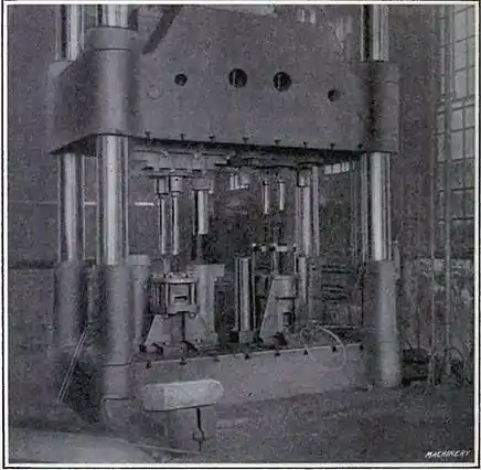 This is a four-post main press with hydraulic piston, and top and bottom slotted plates for mounting attachments. The posts keep the upper and lower jaws of the press parallel as the piston forces the upper jaw down. It includes various inserts for pressing into dies and molds, shearing, rolling, bending, and shaping. Thin metal can be worked at room temperature, while thicker metal sections can be pressed hot (forging). Pressing is not as accurate as machining done by the Mill and Lathe, but is much faster. Figure 5 shows a press very close to the type described with multiple attachments in place. It is an older manual version. The one proposed here would have automated replacement of attachments and feed of materials or blanks for the press.