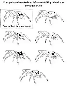 The resulting visual performance is impressive: Jumping spiders such as Portia focus accurately on an object at distances between 2 centimeters to infinity, being able to see up to about 75 centimeters in practice. The time needed to recognize objects is however relatively long (seemingly in the range of 10-20 s) because of the complex scanning process needed to capture high-quality images from such tiny eyes. Due to this limitation, it is very difficult for spiders such as Portia to identify much larger predators fast enough because of the predator´s size, making the small spider an easy prey for birds, frogs and other predators.[5][6]