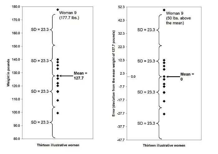 The mean and standard deviation of women's weights are compared to the mean and standard deviation of the error in the mean model for weight in Figure 5-5. The only difference between the two sides of Figure 5-5 is the scale. On the left side, the women's weights are spread around the mean (127.7 lbs.). On the right side, the women's weights are spread around 0. The amount of spread in both cases is the same (standard deviation = 23.3 lbs.).