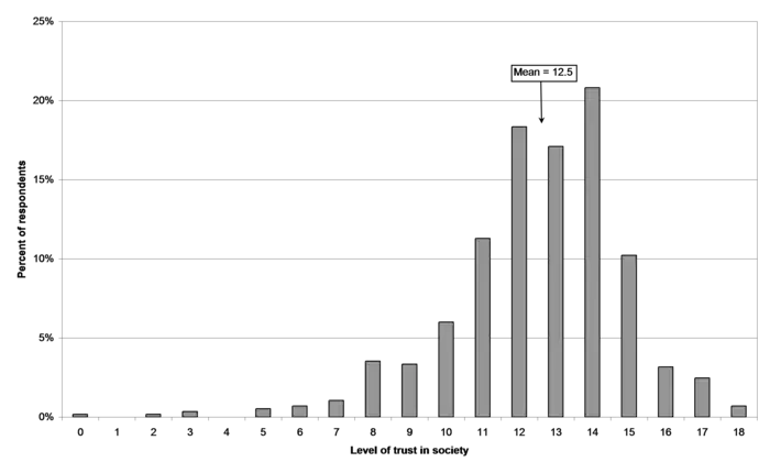 Many people worry that modern society is alienating. Alienation means that people feel disconnected from larger society. Alienation was one of the first problems studied by the sociologists who founded the discipline in the late 19th century, and it continues to be a major concern today. A major symptom of alienation is a lack of trust in society. In small, closed communities where everyone knows everyone else, people have the opportunity to develop trusting relationships over years of mutual interaction. In modern societies, people end up being strangers to the people around them in stores and restaurants, their neighbors, and even their extended families. People still have friends, but their friends are spread out in wide networks. The era of village societies when you were likely to marry your next-door neighbor disappeared long ago. Nonetheless, trust is extremely important for the functioning of modern society, especially in democratic countries. If people don't have trust in society, they won't help their neighbors in times of need, enter into long-term contracts like university degree programs, or participate in democratic elections. At the most basic level, trust in society is necessary for society to function at all. Without it, we're all on our own. The World Values Survey (WVS), conducted in more than 80 countries, includes six questions about trust in society. They are: How much do you trust your family? How much do you trust people in your neighborhood? How much do you trust people you know personally? How much do you trust people you meet for the first time? How much do you trust people of another religion? How much do you trust people of another nationality? Each question can be answered on four levels, ranging from 0 = "No trust at all" through 3 = "Trust completely." An index of overall trust in society can be calculated by adding together each respondent's answers to all six questions. This index, "Trust in society," then ranges from a possible low score of 0 (the respondent answers "No trust at all" on all six questions) to 18 (the respondent answers "Trust completely" on all six questions). Of course, most people fall somewhere in the middle. Using data from the United Kingdom edition of the 2006 World Values Survey (WVS), the mean level of trust in society was 12.5 with a standard deviation of 2.4. Most people in the United Kingdom have a high level of trust in society. The full distribution of trust in society in the United Kingdom is plotted in Figure 9-1.