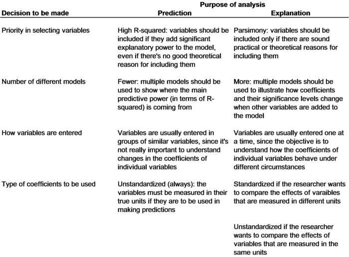 9.2. Explanatory versus predictive models In between the base model and the saturated model, there are no real rules about what variables should be included in regression models or in what order. A common approach is to do what's been done in Figure 9-2: start with the base model, then add the independent variables of interest one at a time in separate models, then report a saturated model in which all of the independent variables are used at the same time. When models are designed to evaluate the relative strengths of different explanations of the dependent variable, the independent variables have to be entered one at a time in separate models. This makes it possible to compare how well each of them explains the dependent variable. Explanatory models are regression models that are primarily intended to be used for evaluating different theories for explaining the differences between cases in their values of the dependent variable. On the other hand, sometimes the objective of a regression analysis is simply to predict the values of a dependent variable, without any interest in the theoretical implications of the models. Predictive models are regression models that are primarily intended to be used for making predictions about dependent variables as outcomes. For example, in Figure 3-9 a very simple predictive model was used to predict levels of soft drink consumption in the US states of Alaska and Hawaii. In predictive models, it is less important to understand how the coefficients of variables change between models or to control for potentially confounding variables. All that really matters is getting a high R2 score, since R2 indicates the proportion of the total variability in the dependent variable that is accounted for by the model. In general, models with higher R2 scores make more accurate predictions of the dependent variable. Some of the key differences between explanatory models and predictive models are laid out in Figure 9-4. A major difference is the way that independent variables are selected for inclusion in each model type. The main objective of an explanatory model is to make inferences about the effects of different independent variables on the dependent variable. Independent variables are carefully selected for inclusion based on specific theoretical reasons, and unimportant or irrelevant variables are never included. Keeping the number of independent variables to a minimum also makes it easier to understand the role each one plays in explaining the dependent variable. In other words, explanatory models place a premium on parsimony. Parsimony is the virtue of using simple models that are easy to understand and interpret. A good explanatory model is one that sheds light on relationships that are of theoretical interest. In contrast, predictive models often take much more of a wild-west, anything-goes approach. So long as the independent variables are correlated with the dependent variable, they help in making predictions. A bizarre example of this is the use of sewage treatment flows in so-called "toilet flush models" of hotel occupancy rates. In beach resort areas, city managers want to know how many visitors they have over a major holiday weekend, but there is no single database that includes a list of all the people who stay in a city's hotels, in private rentals, or visiting friends and relatives. Instead, city managers use the amount of sewage flowing through their sewage treatment plants over the weekend to estimate the number of people who must have been in the city. There's no theoretical sense in which sewage causes people to visit a city, but sewage is a very good predictor of the number of people who actually have visited.
