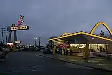 The construction of the interstate system firmly established a car culture in America. Fast Food had existed prior to the 1950's, but the 1950's were when it really became a phenomenon, when franchising locations of popular restaurants became common, eventually leading to the formation of chains with uniform quality and items nationwide.
