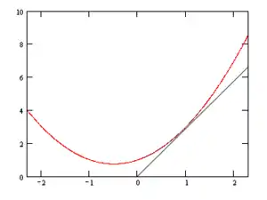 A good way to find these parallel lines is to treat the other variable as a constant. For example, to find the tangent line of the above function at that is parallel to the -axis, we treat as a constant one. The graph and this plane are shown on the right. On the left, we see the way the function looks on the plane . By finding the tangent line on this graph, we discover that the slope of the tangent line of at that is parallel to the -axis is three. We write this in notation as