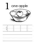 Handwriting worksheet for the number 1 (one) with color-in apple in bowl
