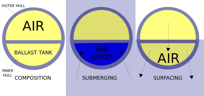 Submarines work in a way that is similar to the ship, except the overall density of the ship can be altered at will so that the submarine sinks or floats as desired. Look at the diagram below. A tank called a ballast tank takes up a significant part of the submarine's area. Note that it does not have to be position like that in the diagram; it can be anywhere the shipbuilder wants it to be. The ballast tank fills up with sea water when the submarine needs to be submerged. When it needs to surface again, the sea water is pumped out of the ballast tank with the air in another tank.